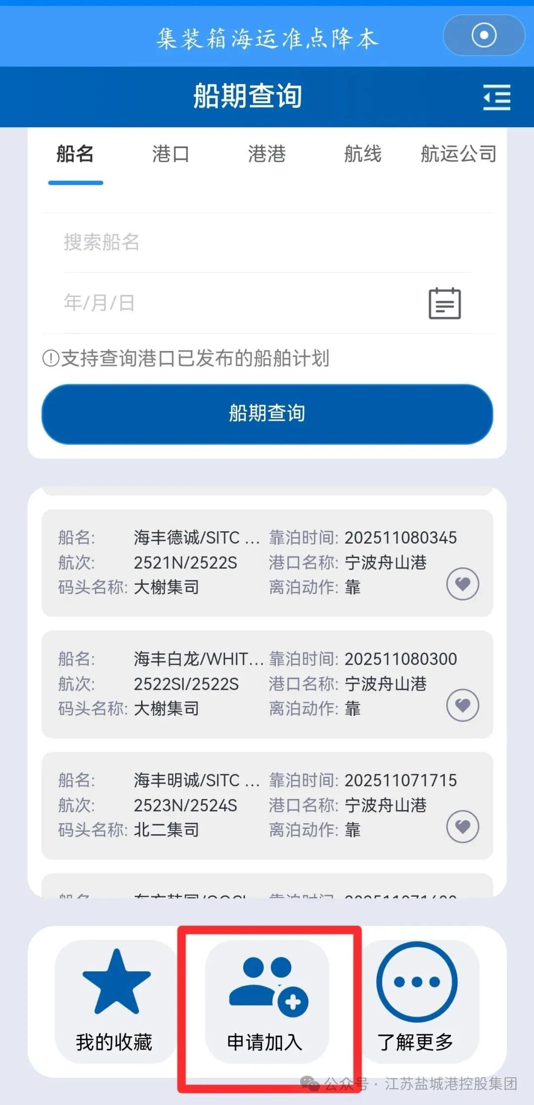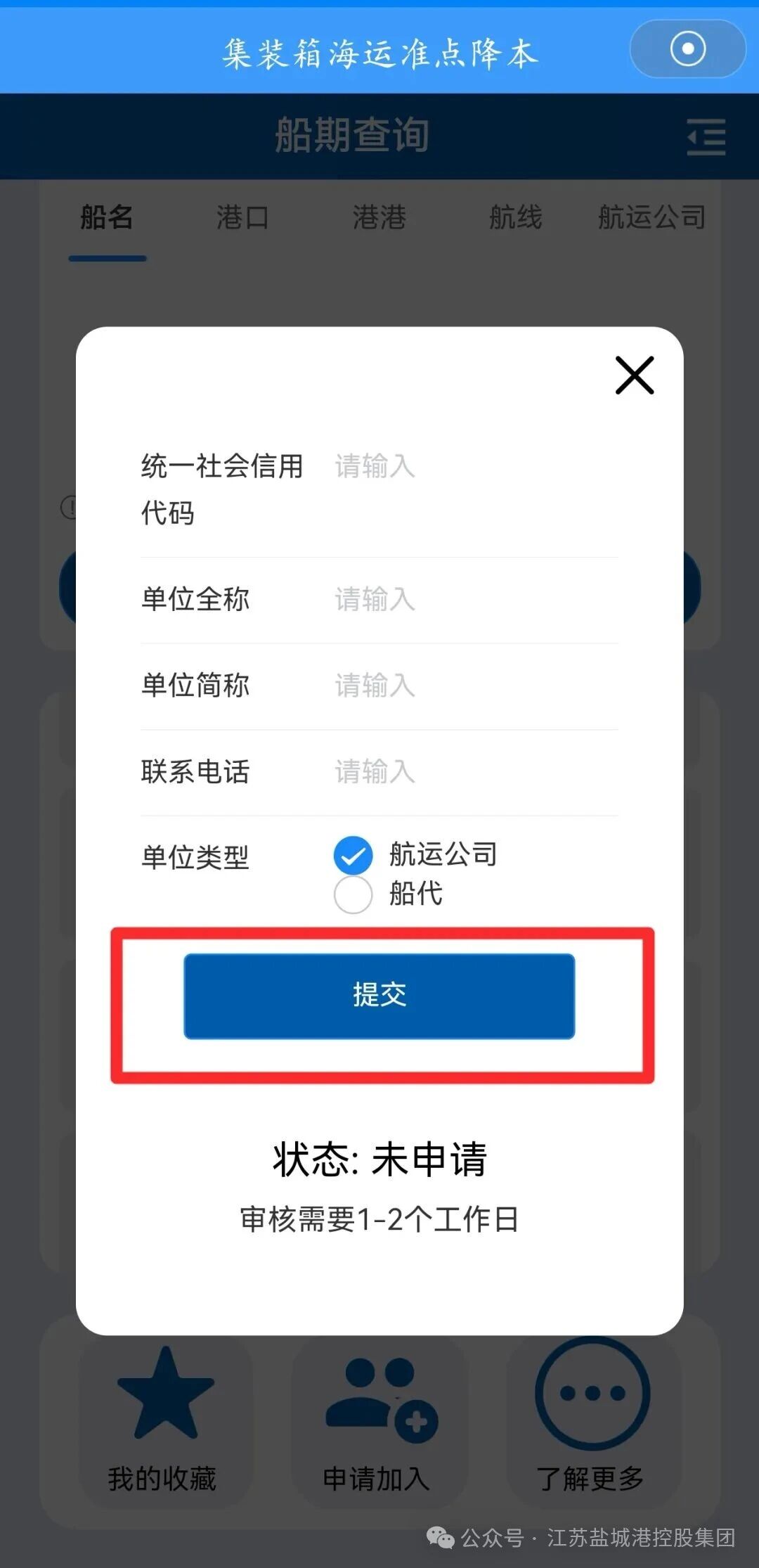 第三步:航運公司第一次登錄該模塊的用戶,系統默認顯示為船期查詢頁面,用戶點擊“申請加入”按鈕,選擇“我要加入”之后,輸入統一社會信用代碼、單位名稱、聯系電話、公司類型等相關信息,提交信息后,1-2個工作日之內,即可獲得完整的“準點降本”模塊使用權限。